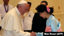 پاپ په داسې حال کې په پلازمېنه نیپیدو کې له مېرمن سوچي سره وکتل چې له روهینګیايي مسلمانانو سره د میانمار «برما» د پوځیانو د تاوتریخوالي او د هغوی د ځورونې په خاطر نړیوالو تُند غبرګونونه ښودلي دي.