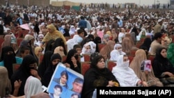 سلګونه کسانو چې پرون په پېښور کې راغونډ شوي وو، د خپلو ورکو عزیزانو نومونه او عکسونه پورته کړي وو.